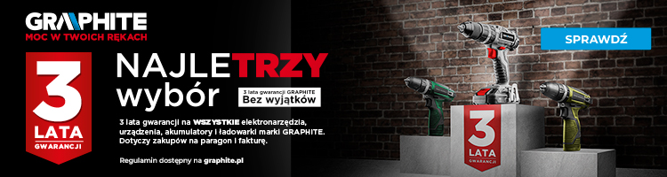 Od 1 sierpnia producent elektronarzędzi i akcesoriów GRAPHITE, będąc pewnym jakości swoich produktów wprowadza program 3-letniej gwarancji "bez dodatkowych wymagań i gwiazdek". Gwarancją objęte są wszystkie produkty zakupione na paragon jak i na fakturę (bez ograniczeń dla firm)! Zasada działania jest bardzo prosta! Aby uzyskać 3-letnią gwarancję wystarczy zakupić produkt - bez zakładania konta, rejestracji i logowania! Gwarancja zaczyna obowiązywać zaraz po zakupie urządzenia! Z programu 3-letniej gwarancji wyłączone są m.in: torby, rękawice, gadżety (termosy, smartwatche), głośniki bluetooth, akcesoria do elektronarzędzi.