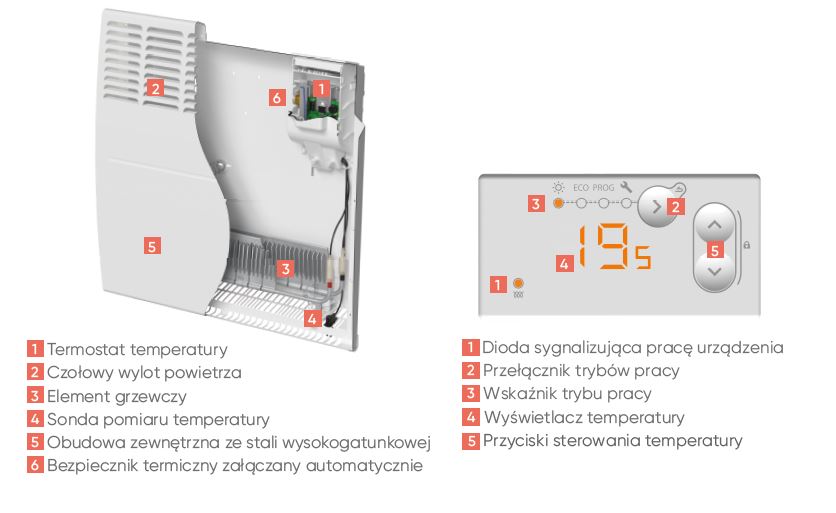 Grzejnik elektryczny naścienny 2000W (25m2) F-120 konwektor elektryczny 002473 ATLANTIC - pojedyncze urządzenie grzewcze wykorzystywane do ogrzania miejsc, gdzie temperatura szybko spada np. domki letniskowe, pomieszczenia socjalne w magazynach jak również sprawdza się we wspomaganiu centralnego ogrzewania (np. domy jednorodzinne). Konwektor elektryczny działa na zasadzie unoszenia się ciepłego powietrza, które szybko rozchodzi się w ogrzewanym pomieszczeniu. Urządzenie sprawdza się również jako system grzewczy sterowany centralnie lub strefowo za pomocą dowolnego programatora zewnętrznego. 99% pobieranej energii przez grzejnik zamieniane jest w ciepło ogrzewanego pomieszczenia.