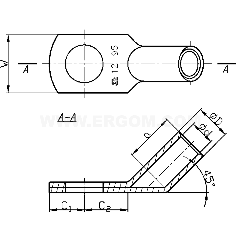 Końcówka kablowa K45R 25/10 E11KM-01050101400 ERGOM - Końcówki kablowe miedziane przeznaczone są do zakończeń przewodów miedzianych. Zastosowanie końcówki kablowej zwiększa bezpieczeństwo naszego połączenia kablowego poprzez zmniejszenie przegrzewania się przewodów i izolacji. Trwałe mocowanie końcówek odbywa się za pomocą specjalnej prasy (w przypadku żył sektorowych należy najpierw przeformować żyłę na okrągło). Produkt został wykonany z najwyższej jakości miedzi, co zapewnia mu długi czas eksploatacji oraz odporność na uszkodzenia mechaniczne. Parametry techniczne: