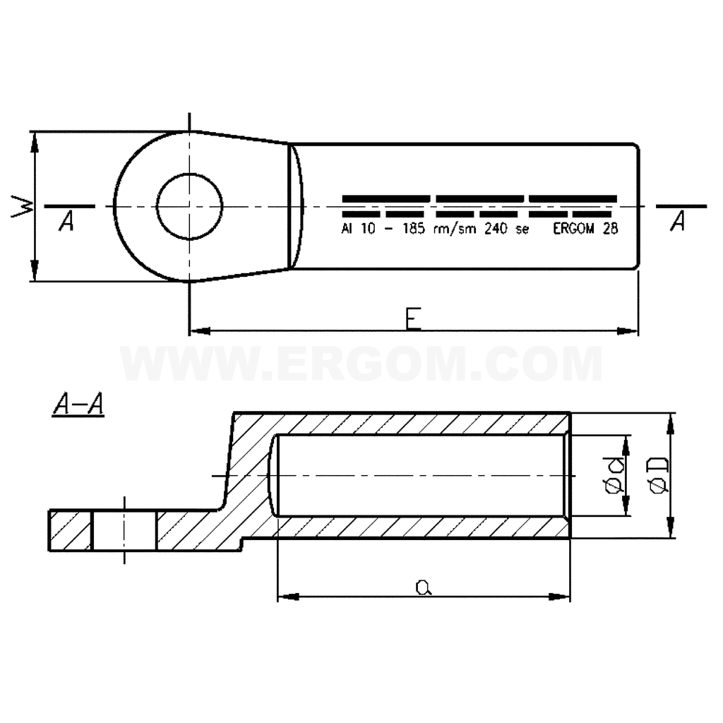 Końcówka kablowa KRA 240/12 (10 SZT.) E12KA-01010103902 ERGOM - Końcówki kablowe aluminiowe przeznaczone są do zakończeń przewodów aluminiowych. Zastosowanie końcówki kablowej zwiększa bezpieczeństwo naszego połączenia kablowego poprzez zmniejszenie przegrzewania się przewodów i izolacji. Trwałe mocowanie końcówek odbywa się za pomocą specjalnej prasy (w przypadku żył sektorowych należy najpierw przeformować żyłę na okrągło). Produkt został wykonany z najwyższej jakości aluminium, co zapewnia mu długi czas eksploatacji oraz odporność na uszkodzenia mechaniczne. Końcówki zostały wypełnione smarem kontaktowym. Parametry techniczne: