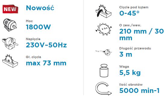 Pilarka tarczowa 1800W 230V tarcza 210x30mm obroty 5000 min-1 cięcie pod skosem 0-45st. 58G493 GRAPHITE