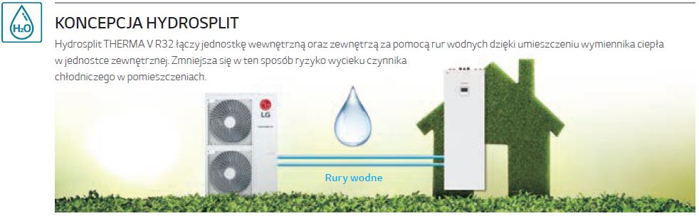 Pompa ciepła typu hydrosplit LG Therma V Hydrosplit 16kW 3F 400V Hydrosplit IWT (zintegrowany zbiornik 200l) czynnik R32 HU163MRB/HN1616Y.NB1 LG ELECTRONICS - pompy ciepła typu HYDROSPLIT dzielą się na dwie główne jednostki +CWU: wewnętrzną i zewnętrzną + zasobnik na ciepłą wodę użytkową (IWT). Jednostka zewnętrzna (HU) jak sama nazwa wskazuje montowana jest na zewnątrz, zaś jednostka wewnętrzna (HN) wraz ze zbiornikiem wewnątrz budynku. Jednostka zewnętrzna (agregat) posiadająca cały układ chłodniczy odpowiada za pozyskiwanie energii z otoczenia, zaś jednostka wewnętrzna (hydrobox) za pomocą układu hydraulicznego i elektrycznego przekazuje pozyskane ciepło do instalacji grzewczej. Obie części połączone są rurami wodnymi. Optymalna długość instalacji to zakres 3 ~ 10m - pozwala to na zachowanie nominalnej wydajności urządzenia, eliminuje ewentualny hałas przepływu wody do hydroboxu i wpływa pozytywnie na poprawność działania.