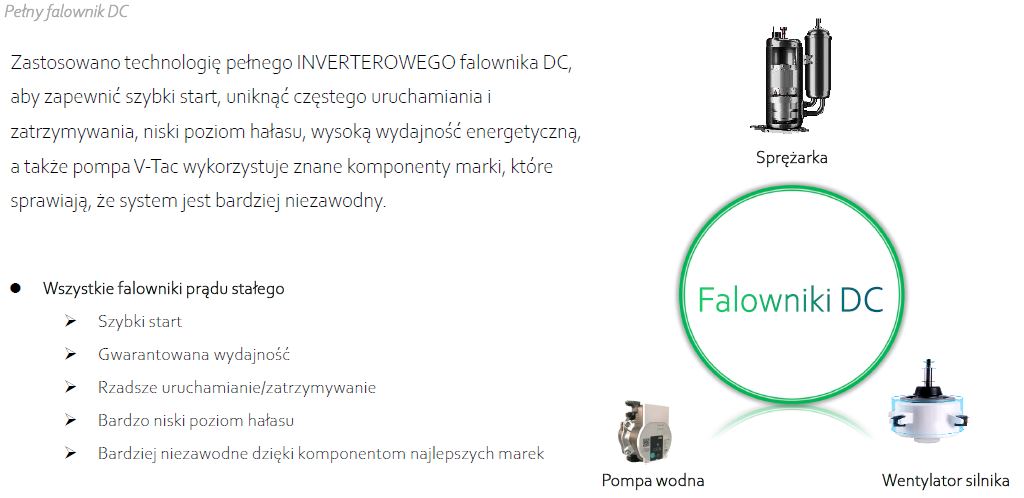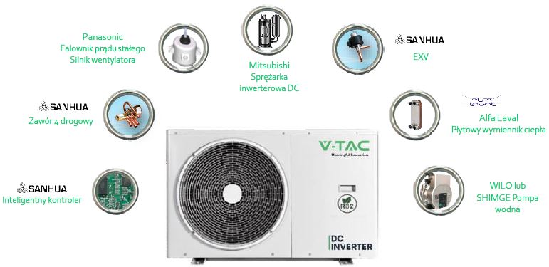 Pompa ciepła typu monoblok 3-fazowa 14kW 380-415V ATW sprężarka inw. R32 wentylator DC grzałka podtrzymującą 9kW VT-M14KW-P3H9-W 11459 V-TAC - pompy ciepła typu monoblok charakteryzują się połączeniem jednostki wewnętrznej i zewnętrznej w jedno urządzenie. Takie rozwiązanie pozwala na podłączenie z instalacją wewnętrzną tylko rurami wodnymi (nie ma potrzeby instalacji rur chłodniczych). Pompa ciepła powietrze-woda wykorzystuje energię z odnawialnego źródła tzn. powietrza. Urządzenie pobiera energię z powietrza i przekazuje ją do wody. Energia cieplna jest dostarczana przez obieg czynnika chłodniczego, a pozyskana energia cieplna jest przekazywana do wody przez wymiennik ciepła. Pompa ciepła ATW zużywa mniej energii niż piece i gazowy lub elektryczny podgrzewacz wody. System pomp ciepła ATW, integruje ogrzewanie, chłodzenie i ciepłą wodę użytkową w celu zapewnienia użytkownikom kompletnych rozwiązań. Ponadto w większej funkcjonalności, może współpracować z dodatkowym źródłem ogrzewania, takim jak elektryczne podgrzewacze wody, tradycyjne kotły gazowe, słoneczne podgrzewacze wody lub panele fotowoltaiczne. Głównymi i najważniejszymi komponentami pomp ciepła V-TAC są: Inteligentny kontroler (producent SANHUA), zawór 4- drogowy (producent SANHUA), falownik prądu stałego i silnik wentylatora (producent PANASONIC), sprężarka inwerterowa DC (producent Mitsubishi), elektroniczny zawór sterujący przepływem czynnika chłodniczego R32 (producent SANHUA), płytowy wymiennik ciepła (producent ALFA Laval) i pompa wodna (producent WILO lub SHIMGE). Pompy ciepła V-TAC objęte są 5-letnią międzynarodową gwarancją. Po instalacji i uruchomieniu urządzenia, użytkownik końcowy nie płaci za rozruch pompy! Pierwszy start urządzenia odbywa się przez autoryzowanego serwisanta V-TAC opłacanego przez V-TAC. Kontakt poprzez system zgłaszania i monitoringu wszystkich zgłoszeń i instalacji.