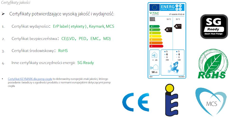 Pompy ciepła V-TAC posiadają wszystkie odpowiednie certyfikaty świadczące o najwyższej jakości i wydajności produktu.