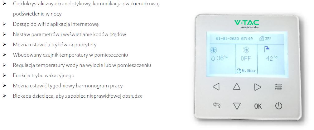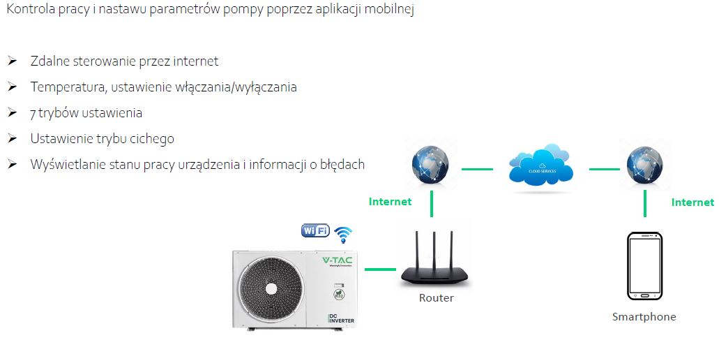 Sterowanie i zarządzanie pompą ciepła V-TAC może odbywać się za pomocą inteligentnego, bezprzewodowego sterownika jak również za pomocą aplikacji poprzez smartfon lub tablet.