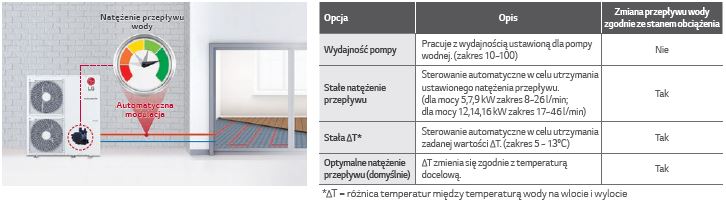 - zaawansowane sterowanie pompą wody (optymalne natężenie przepływu, stała wydajność, stała wartość przepływu, stała ?T),