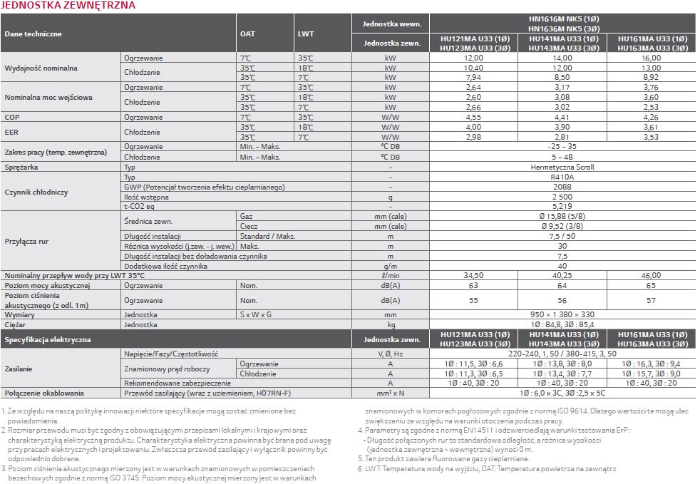 - Jednostka zewnętrzna HU (agregat): sprężarka R1 i wymiennik z powłoką Black Din (czynnik/powietrze),