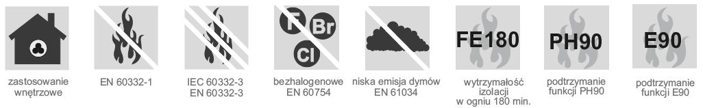 - Odporność izolacji na długotrwałe działanie ognia (trwałość izolacji) FE180: PN-IEC 60331-21, IEC 60331-21