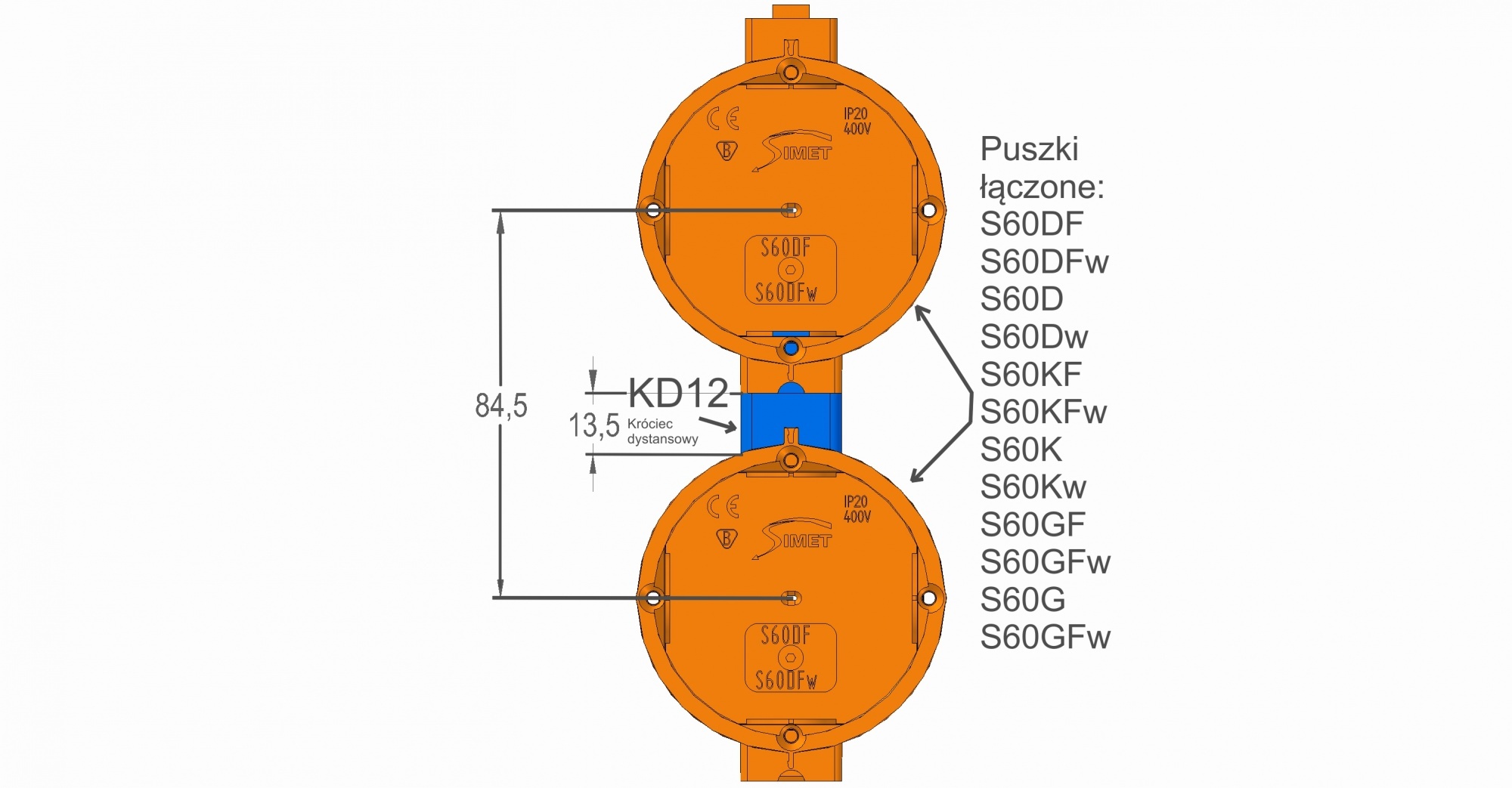 Puszka podtynkowa S60GF 60 mm ekstragłęboka 80 mm szeregowa pomarańczowa 33008008 SIMET
