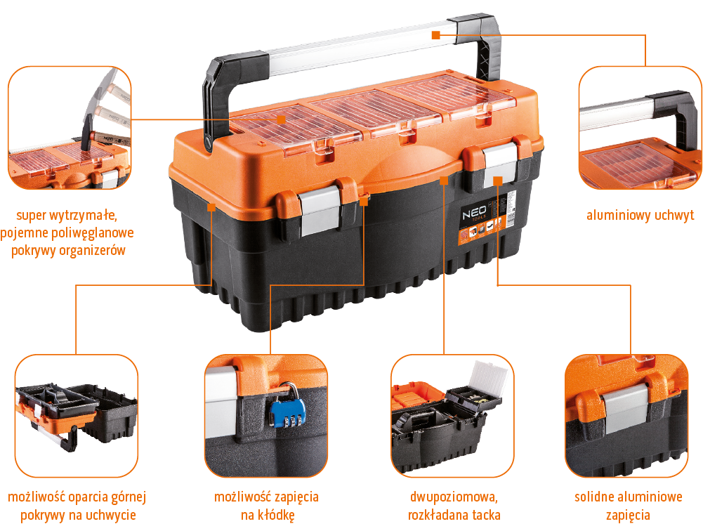 Skrzynka narzędziowa 20" z tacką i 2 organizerami 84-105 NEO TOOLS - wykonana z wytrzymałego tworzywa sztucznego z aluminiowymi zapięciami i uchwytem. Posiada 2 organizery na drobne elementy i rozkładaną tackę. Skrzynka dla bezpieczeństwa posiada miejsce na kłódkę. Parametry techniczne: