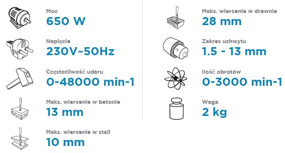 Wiertarka udarowa 650W 230V uchwyt kluczykowy 13mm obroty 0-3000 min-1 58G726 GRAPHITE - jest uniwersalnym narzędziem, które doskonale radzi sobie z materiałami takimi jak: drewno, tworzywa sztuczne, metal i ceramika, a po przełączeniu w tryb udarowy również z betonem lub cegłą. Urządzenie posiada możliwość obrotu głowicy w prawo i lewo. Niewielka waga, ergonomiczna konstrukcja, ogumowana rękojeść i długi przewód zasilający sprawiają, iż praca z urządzeniem jest wygodna i bezpieczna. W zestawie znajduje się: