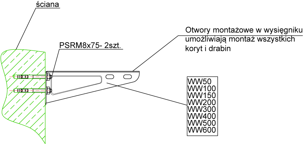 Wysięgnik wzmocniony WW100 710410 BAKS- Standardowy wysięgnik producenta BAKS. Wysięgnik posiada wiele zastosowań - za jego pomocą możemy zamocować korytka siatkowe lub zwykłe, drabinki kablowe, rury elektroinstalacyjne oraz inne elementy instalacji elektrycznej. Wysięgnik wykonany został ze stali ocynkowanej ogniowo - zapewnia to skuteczną ochronę przed rdzą. Jego montaż odbywa się do ściany za pomocą dwóch śrub PSRM8x75. Wymiary wysięgnika wynoszą 110 x 26 x 70 mm. Parametry techniczne: